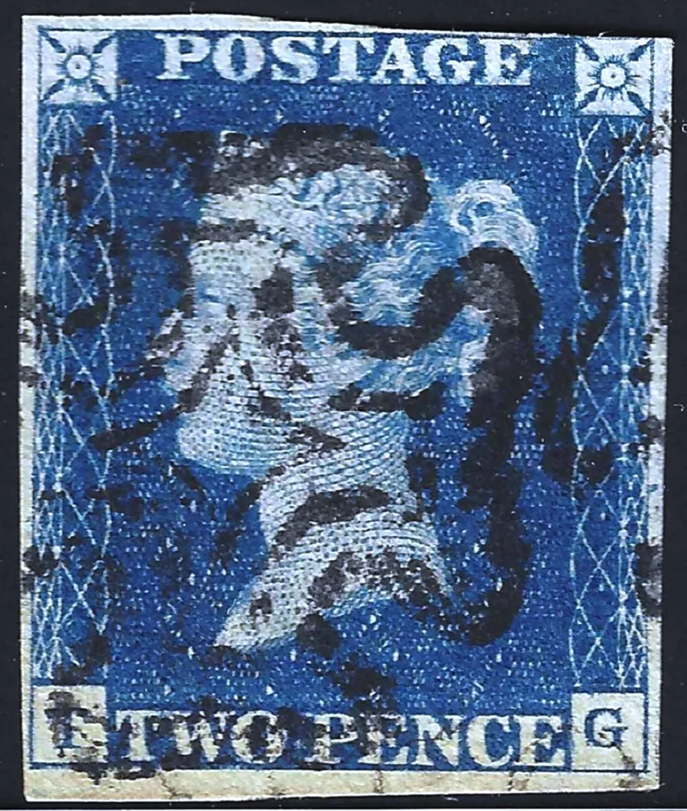 SG.5 2d Blue Plate 2 (TG) with multiple Black Maltese Crosses contrary to post office regulations. Just shaved upper right.