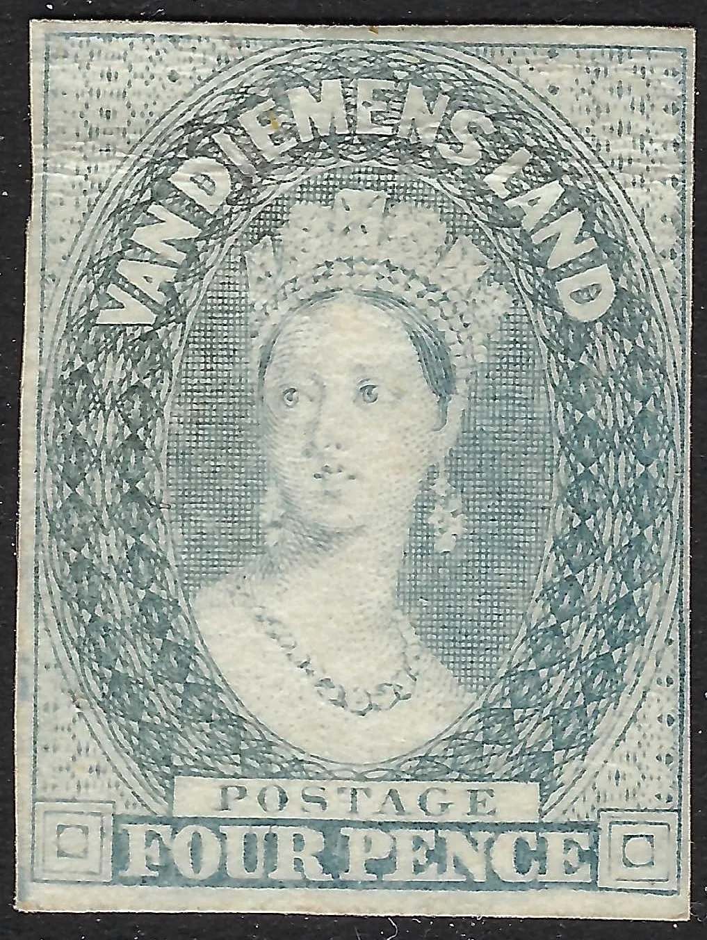 Tasmania SG.18var 4d Blue Perkins Bacon & Co Die Proof in Pale Blue. SG Footnote states that these were printed on thick unwatermarked paper and that the proof sheet was creased. An incredibly scarce item.  Tasmani was formerly known as Van Diemans Land.