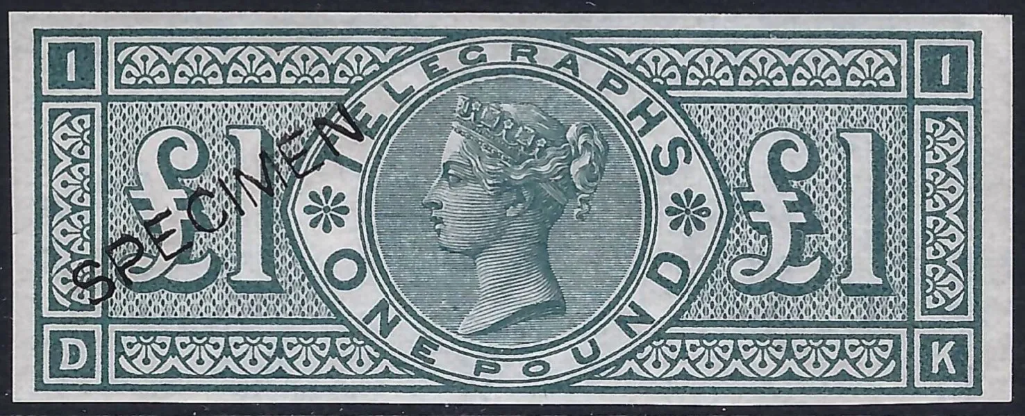 • GB QV 1877 £1 grey-green imperf colour trial L236 Telegraphs stamp (dk) with specimen type 8 overprint (MNH)
