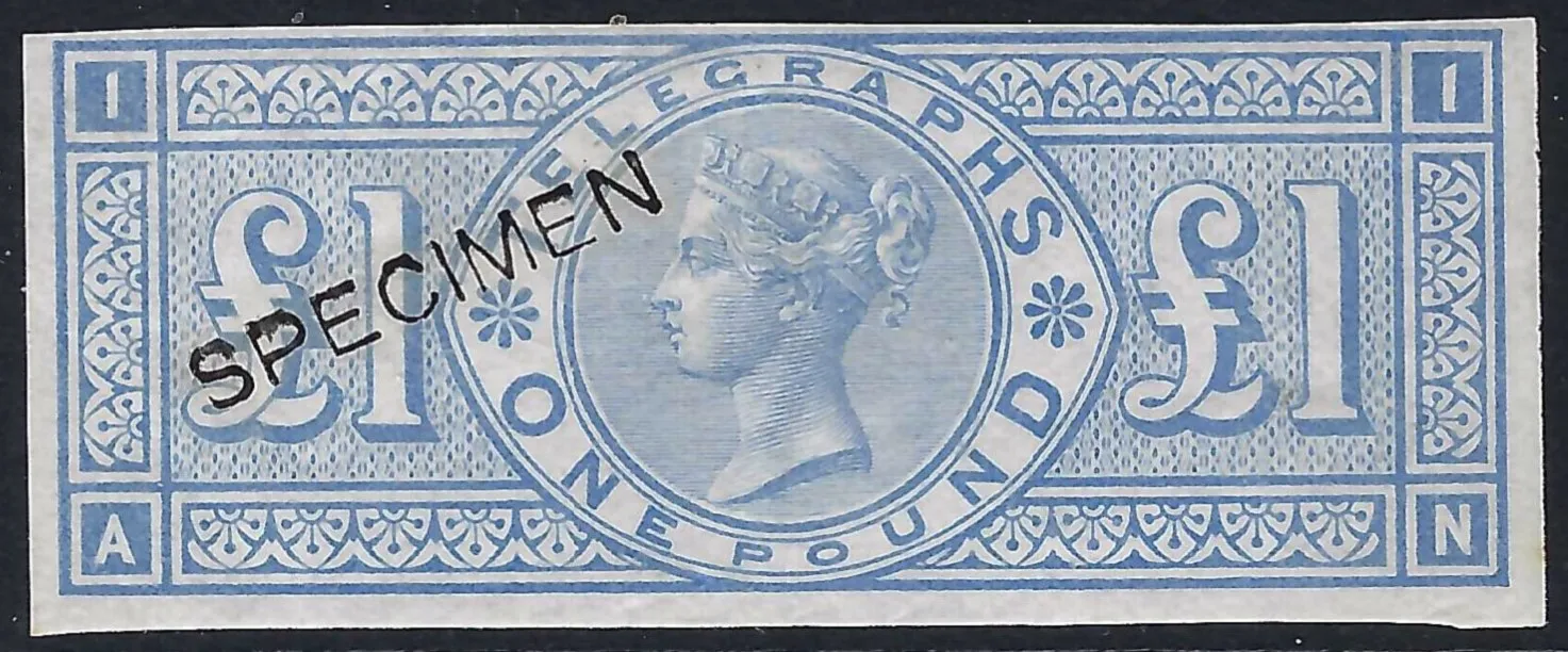 • GB QV 1877 £1 pale ultramarine imperf colour trial L236 Telegraphs stamp (AN) with specimen type 8 overprint