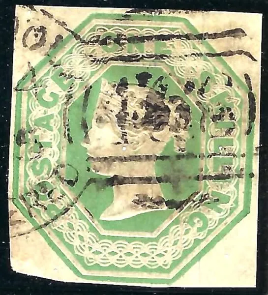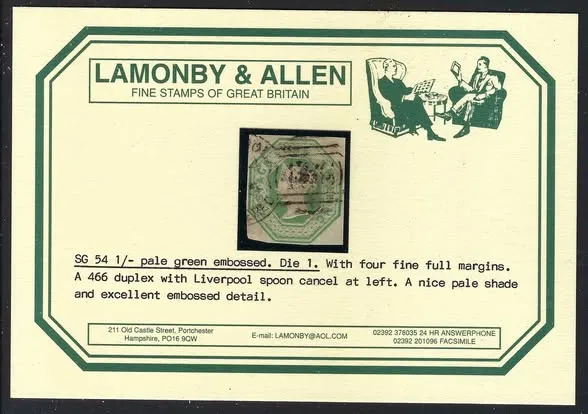 GB QV SG54 1/- Pale green with 4 good clear mArgins and liverpool (466) registered spoon cancel (RA71). SG Cat £1000