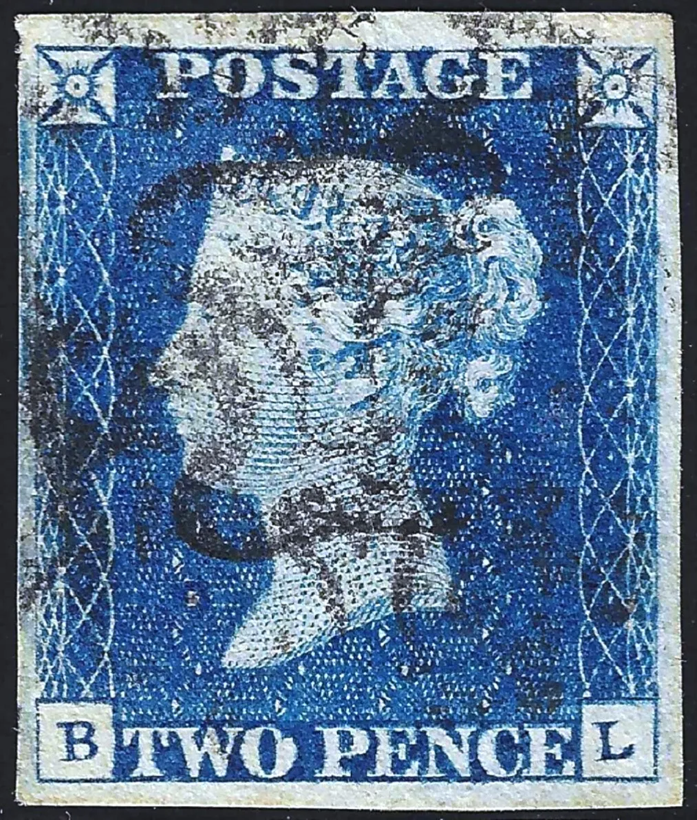 SG.5 2d Blue Plate 1 (BL) with multiple strikes of a Black Maltese Cross contrary to post office regulations and 4 very large margins.